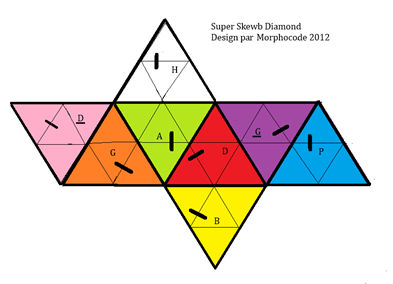 Le Skewb Diamond est un gros puzzle un peu "exotique" formé de 8 faces triangulaires dont chaqu'une possède 4 petit triangles. Il a 6 sommets et 8 centres.